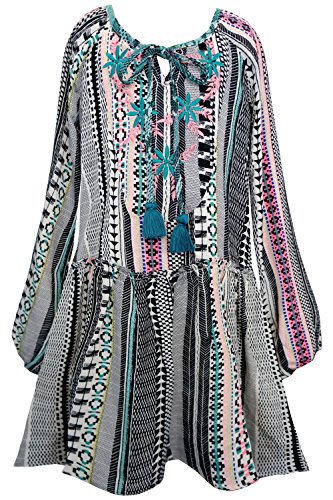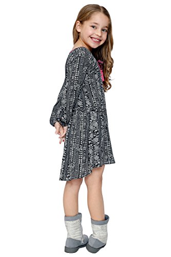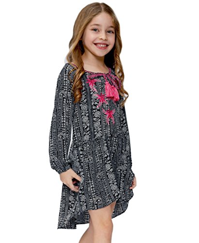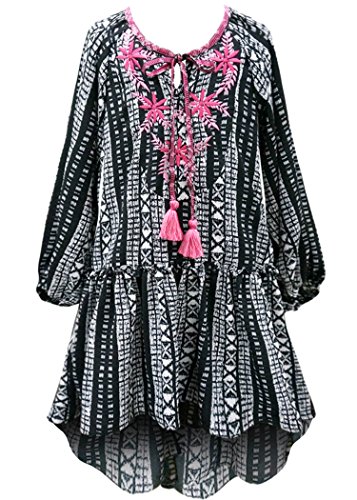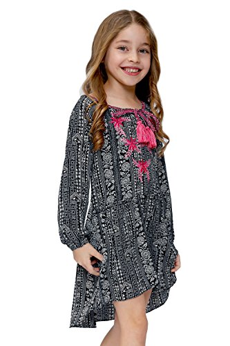 Your bohemian girl's dream come true with this hi low dress from Truly Me! The garter sleeve dress features a hi low hem on a dropped waist skirt with a gorgeous pink floral embroidery on top complimenting an ethnic bohemian print throughout, finished with a touch of fun with pink tassels. The perfect dress for fall layering, summer time playing, and all season styling!Feature