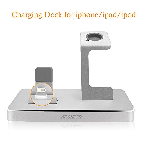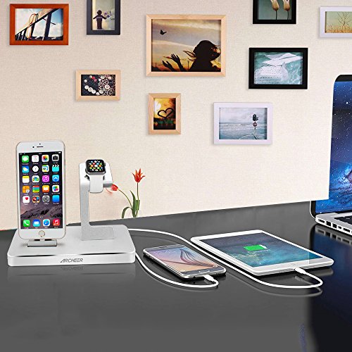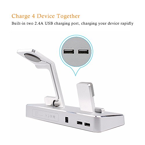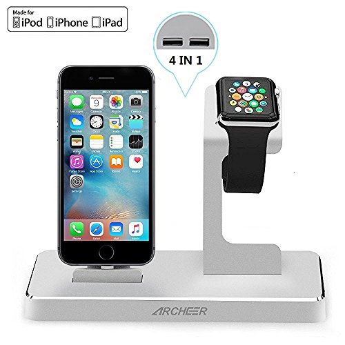 ARCHEER 4 in 1 Apple Watch Stand iPhone Charging Dock with 8 Pin Lightning Adapter , Apple Charging Station with 2x2.4A USB Output for Apple Watch iWatch iPhone iPad iPod and Other Tablets (Silver)