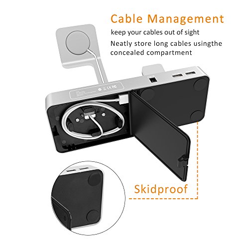Charge 4 Devices at the Same Time: Preset with cable grooves for running the Apple Watch magnetic charger cable, build-in 8 pin lightning adapter allows you to charge your iPhone directly, two additional 2.4A USB Output for any other two devices.