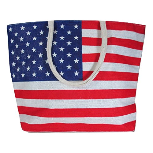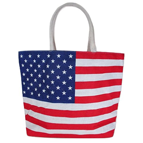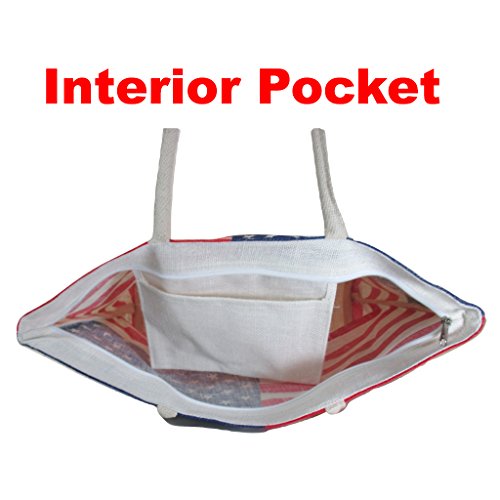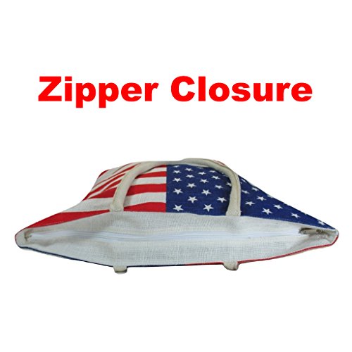 Jute Bag for Women, Burlap Shoulder Tote with US American Flag Print, Interior Pocket, Zipper Closure