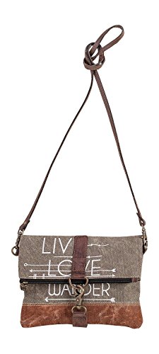 The Live Love Wander Fold-Over Crossbody bag features a beautiful two-tone brown canvas with Live Love Wander stenciled on the front