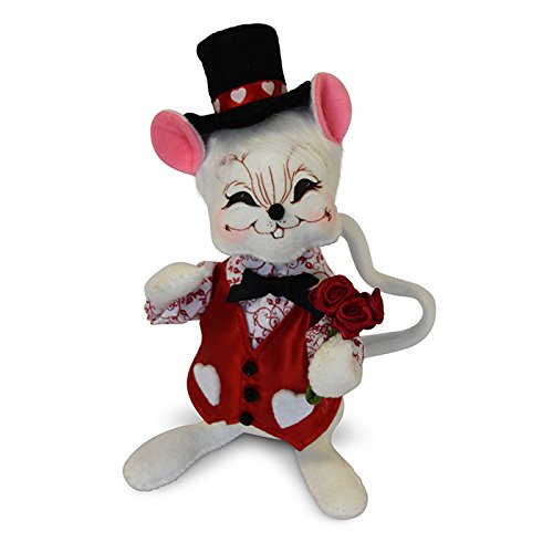 - This 6 inch white mouse is wearing a red vest accented with white heart shaped pockets. He is wearing a shirt done in a delicate red and white filigree print accented with a black bowtie.