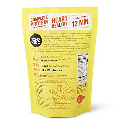 - COMPLETE PROTEIN - Tiny Hero Golden Quinoa is the seed of the Chenopodium quinoa plant and has 6g of protein per serving. It's Heart Healthy and is a great replacement for rice in cookbook recipes. Just substitute Tiny Hero Golden Quinoa for rice!
