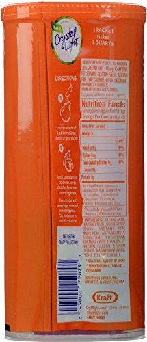 -. Feature : Each Crystal Light Raspberry Iced Tea Canister Contains 6 2-Quart (6 2-Liter) Packets / Crystal Light Raspberry Iced Tea is 99% Caffeine Free (10 mg Caffeine Per Serving) / Crystal Light Raspberry Iced Tea is a Kosher Product, Low in Sodium and Gluten Free / Each Crystal Light 8 Ounce Serving Contains 5 Calories