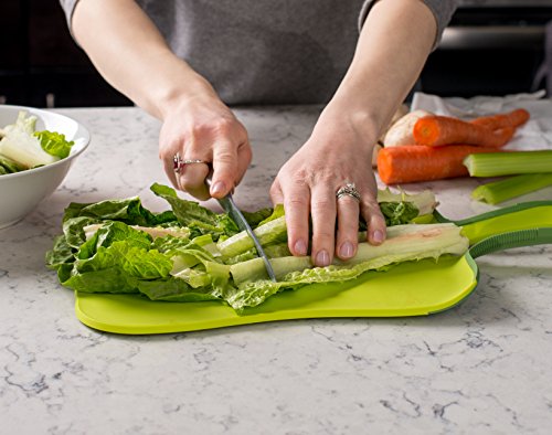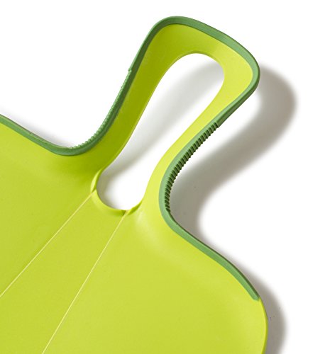 WITH A COMFORTABLE HANDLE: The Cutting Board has a smart, raised handle that makes it easier to pick it up from the counter. The handle is also very comfortable due to its ergonomic design. It is nonslip and will fit perfectly in your palm. To pick the Mat up, you simply have to squeeze the handle to turn the Cutting Board into a dustpan-like shape. Its comfortable and stable grip will not fail you.