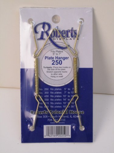 -. Binding : Kitchen -. Brand : Roberts -. Color : brage -. EAN : 0752029917165 -. Feature : Metal Plate Hanger fits 5 / Holds your plate tight to hanger / Easy to hang, fits plates 5 inches to 7 inches / Brass sP.R.Ing tension wire / Made in Taiwan, New, unopened -. Label : Roberts -. Manufacturer : Roberts -. ProductGroup : Home -. ProductTypeName : HOME -. Publisher : Roberts -. Studio : Roberts -. Title : Roberts Colonial Metal Plate Hanger 5 -. UPC : 752029917165