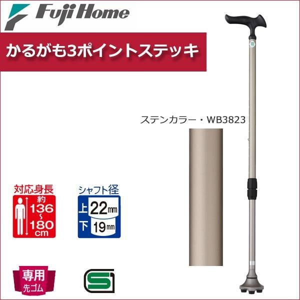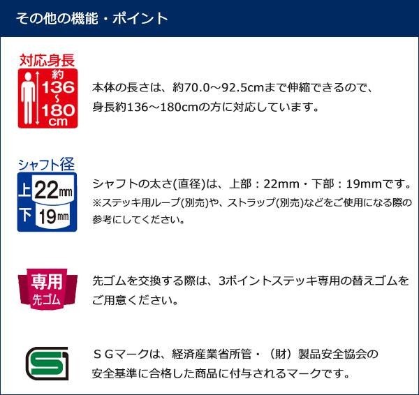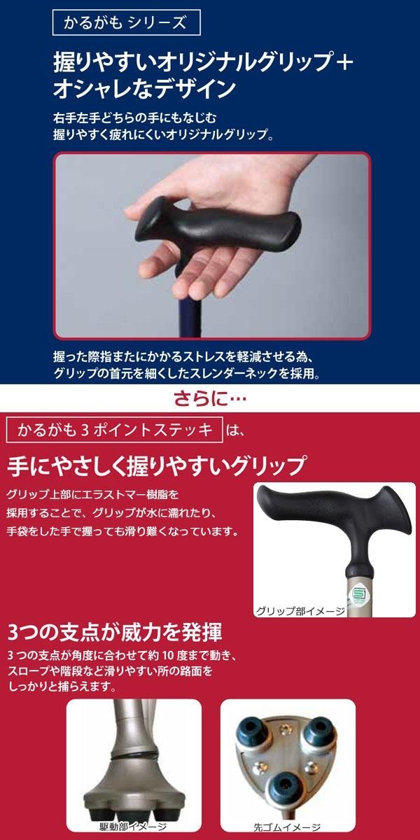 かるがもシリーズは握りやすいオリジナルグリップを採用しています。かるがも3ポイントステッキは、さらにグリップ上部にエラストマー樹脂を採用しているので、水で濡れても手が滑り難くなっています。石突部分の3つの支点が、滑りやすい所の路面をしっかりと捕えます。 |