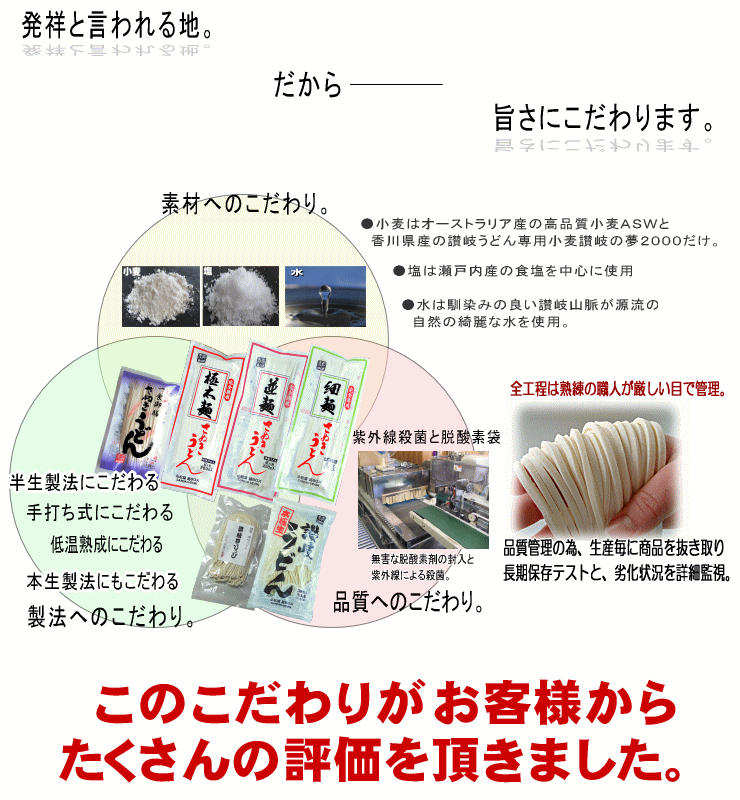 | 調理方法 | 多目のお湯でうどんを茹でた後、流水でもみ洗いをして表面のぬめり、塩分を 取り除き、器に盛ります。 |