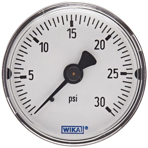 WIKA 4302028 Commercial Pressure Gauge, Dry-Filled, Copper Alloy Wetted Parts, 2" Dial, 0-30 psi Range, +/-3/2/3% Accuracy, 1/4" Male NPT Connection, Center Back Mount
