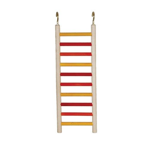 Product Description Red and yellow rung ladder for parakeets. Wood, with two hooks on top of ladder for easy attachment to any cage. GOOD FOR SMALLER BIRDS CANARIES LOVE BIRDS COCKATIELS BUDGIES FINCHES OR PARAKEETS 0
