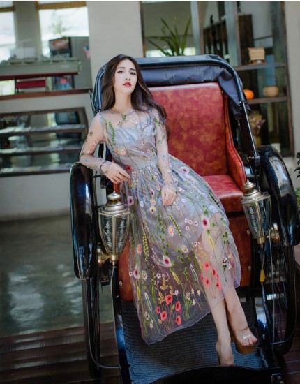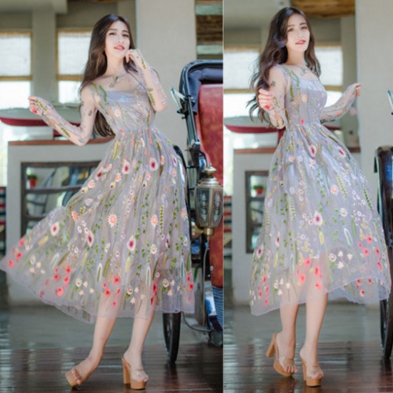 パーティードレス ミモレ丈 ワンピース シースルー 透け感 花柄刺繍 ボタニカル刺繍 フェアリー 大人 上品 可愛い お呼ばれ drgz2539