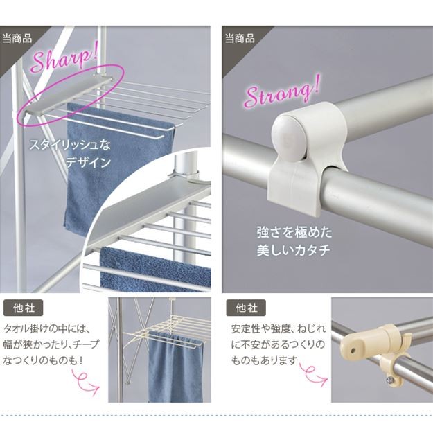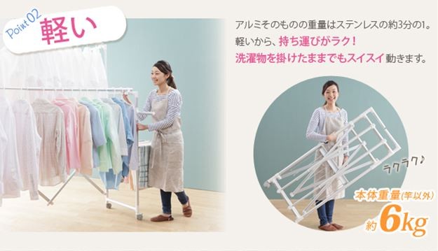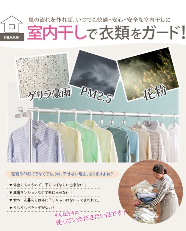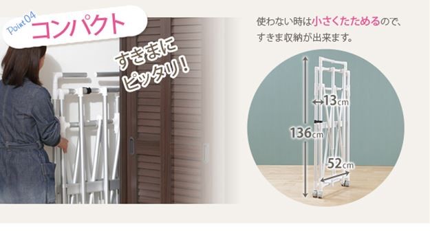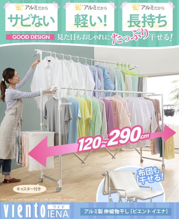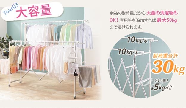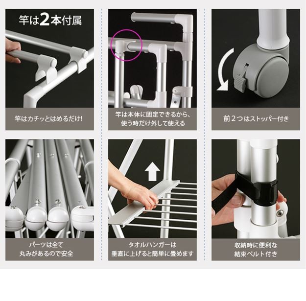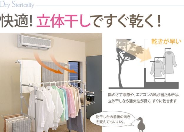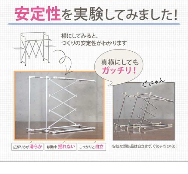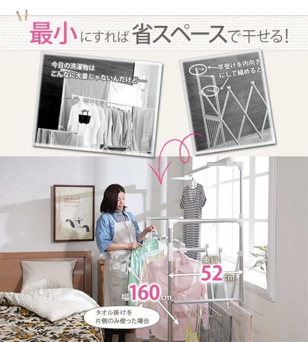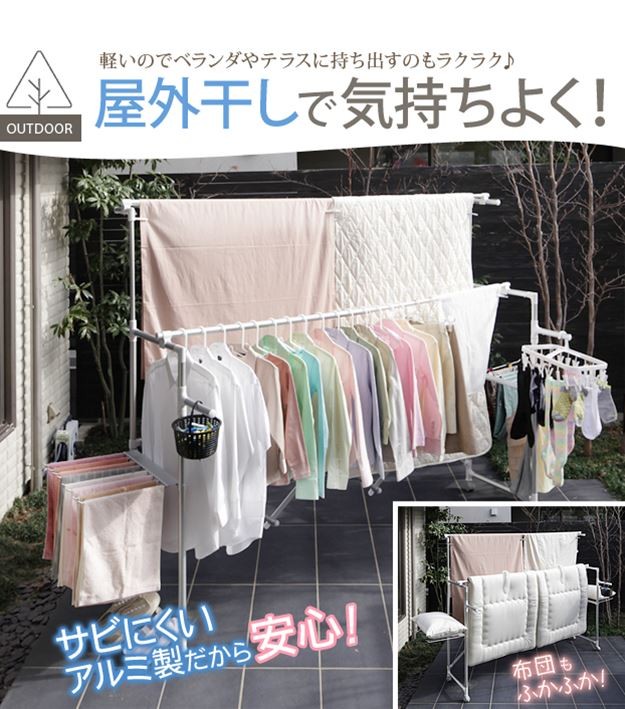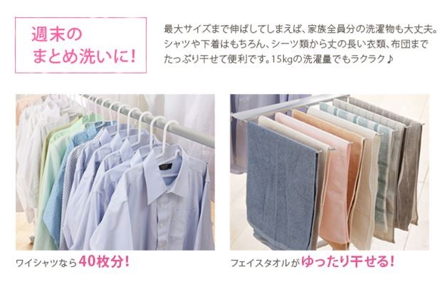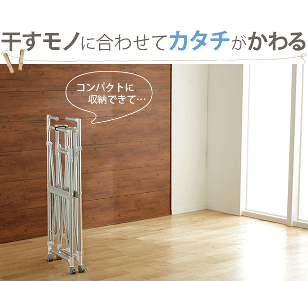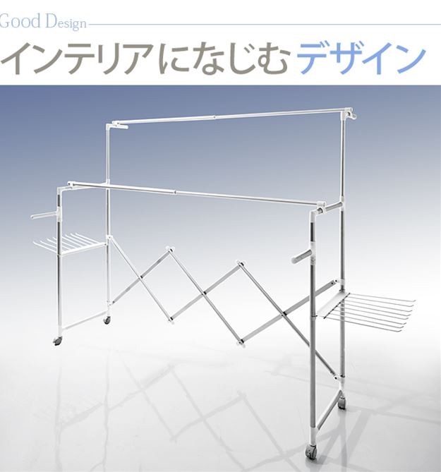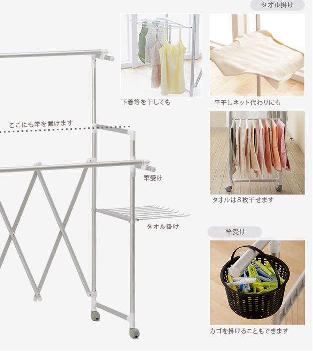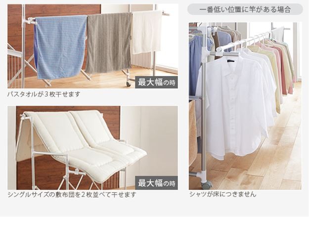場所や洗濯物の量に合わせて幅も高さも伸縮自在!スペースを無駄なく活用できる室内物干し。大きな洗濯物までしっかり干せて花粉や梅雨の季節も安心☆竿(別売)を追加すれば布団を立体的に干せます。キャスター付きですので収納や移動もラクラク♪