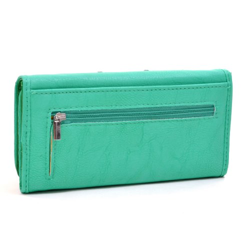 -. Feature : Style: Wallets - Tri-Folds / Color: Variety As Pictured / Material: Faux Leather / Ten Credit Card Slots, Two See Through Drivers License Slot, Pen Holder , Silver Tone Matching Studs, Zipper and Snaps / Approx. Size: 7.5"W x 4"H x 1.20"D