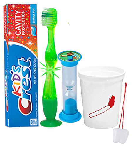 -. Feature : Turn something your kids have to do into something they want to do...Because when brushing is fun, it gets done! / (1) Firefly Youth Flashing Lights Suction Cup Toothbrush (Assorted Colors) (1) Kids Crest Cavity Protection Sparkle Fun Toothpaste, 2.7 oz / (1) Minecraft TorchThemed 16oz Plastic Mouthwash Rinse Cup, Doubles As Toothbrush Holder! / (1) Dentist Recommended 2 Minute Minecraft Themed Brushing Timer (Assorted Styles) / Plus Bonus "Remember to Brush" Visual Aid Tooth Saver Necklace. Hang it in their bathroom or by their bed so they remember to keep their chompers sparkly fresh. You could also use these tooth charms to save one of your child's baby teeth.