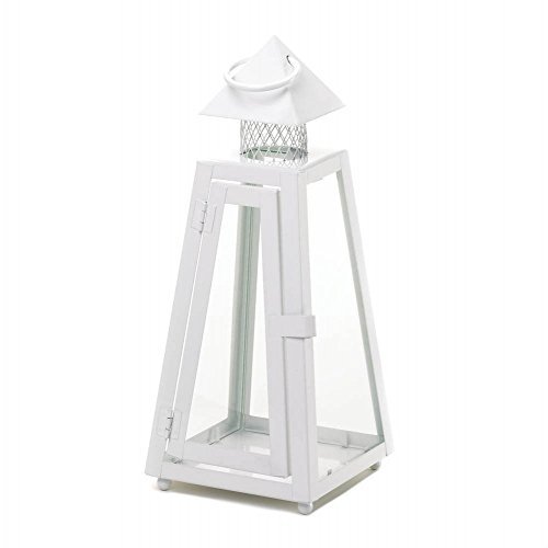 -. Feature : This stunning iron candle lantern shows off the architectural detailing, and the clear glass panels will let the light from your favorite candle shine bright. / This candle lantern is alluring set on a tabletop or hanging from its top loop. / The white finish lends itself to being equally at home in a modern setting as it is in a charming cottage or bungalow. Item weight: 1.6 lbs. / 5" x 5" x 11 1/2" high; 12 5/8" high with handle. / Iron and glass