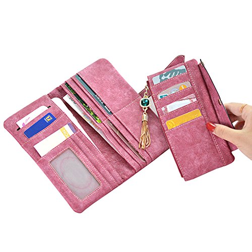 - ★ LARGE CAPACITY ★: Dimension: 7.32"L x 3.74"W x 1.1"H; Weight: 0.33 pounds. Multifunctional with 17 card slots(including 1 id window),3 full-length bill compartments, 3 zipper pockets, 1 snap cash pocket ,1 phone case and 1 inside compartment.Keep your credit cards, cash, coins, receipts,checkbook and your cell phone well organized.Ultra Practical and making lady’s wallet more functional and save for personal data.