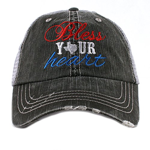 -. Binding : Apparel -. Brand : Katydid -. Department : womens -. Feature : Distressed cap gives it a worn look / Adjustable Velcro Strap with Mesh Back / High Quality Embroider / Officially Licensed by Katydid -. Model : KDC-TC-BYH -. PackageQuantity : 1 -. ProductGroup : Apparel -. ProductTypeName : HAT -. Title : Bless Your Heart Southern Texas Women's Trucker Hat Cap by Katydid