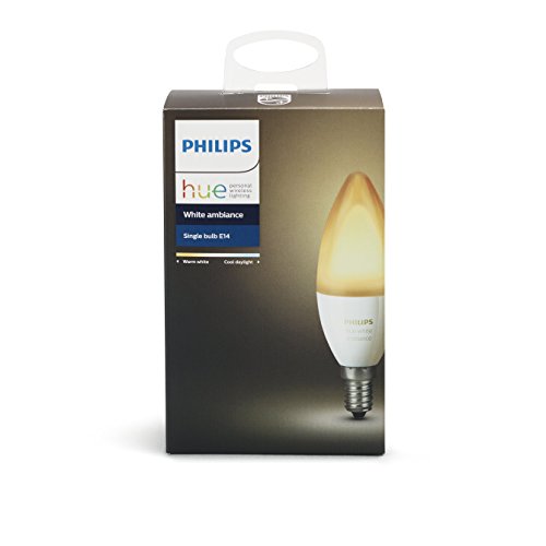ReleaseDate : 2017-07-02 Studio : Philips Publisher : Philips Binding : Tools Home Improvement Product Description From sunrise to sunset, the Philips Hue White Ambiance E12 6W Equivalent Dimmable LED Smart Bulb changes how you light your moments at home. With wireless control on your smartphone or tablet, choose the perfect light setting for any mood or activity such as reading or relaxing, concentrating, or energizing. Requiring the Hue Bridge (sold separately) for the full Hue experience, this E12 LED smart light is designed to fit candelabra lamps in nightlights, chandeliers, and more. Install the LED light as you would install an ordinary bulb, pairing it with the Hue Bridge, which allows you to control smart-bulb-equipped lights via the downloadable Philips Hue App. Easily expand your lighting system with accessories (sold separately), such as a Hue Dimmer Switch, Hue Tap, or Hue Motion Sensor. Pair it for automation with your existing Nest or SmartThings system. This box includes one Philips Hue white E12 light bulb, manual, and two-year warranty. 0