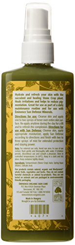 Eminence organics stone crop hydrating mist(4.2 Ounce/125 ml)benefits for skin including sensitive, pigmented sun damaged skin types this mist is designed to hydrate, refresh and tone helps to lighten unwanted pigmentation while removing all traces of previous make up, facial products, and impurities features natural stone crop juice hydrates, heals and lightens pigmentationspring water supplies minerals and softens the skin salicylic acid exfoliates skin to remove all surface impuritieseminence organics is a highly effective, entirely organic skin care line. With all naturally organic ingredients these hand made products are effective and extremely healing. Rich in vitamins, active ingredients and nutrients, eminence products will give you immediate results that you will see and feel.Feature