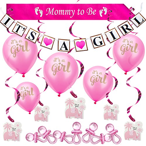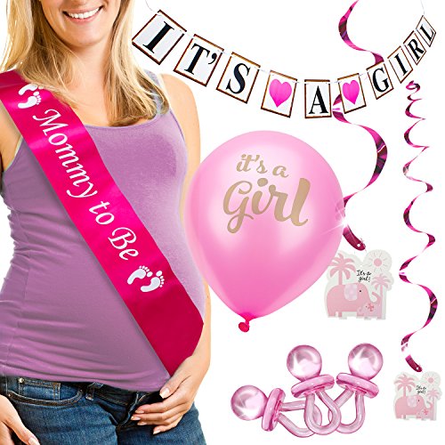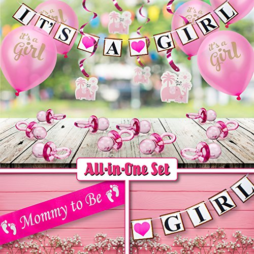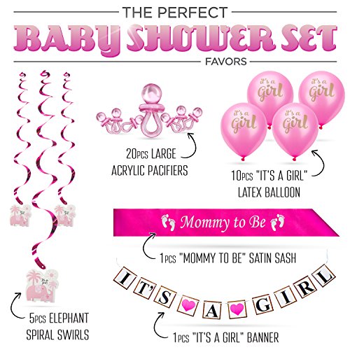 Baby Shower Party Decoration Set for Girl. All-in-1 Perfect Bundle & the Hottest Favors (37 psc) - “It’s A Girl” Banner & Balloons, “Mommy to Be” Sash, Elephant Swirls & Large Acrylic Pacifiers. Pink
