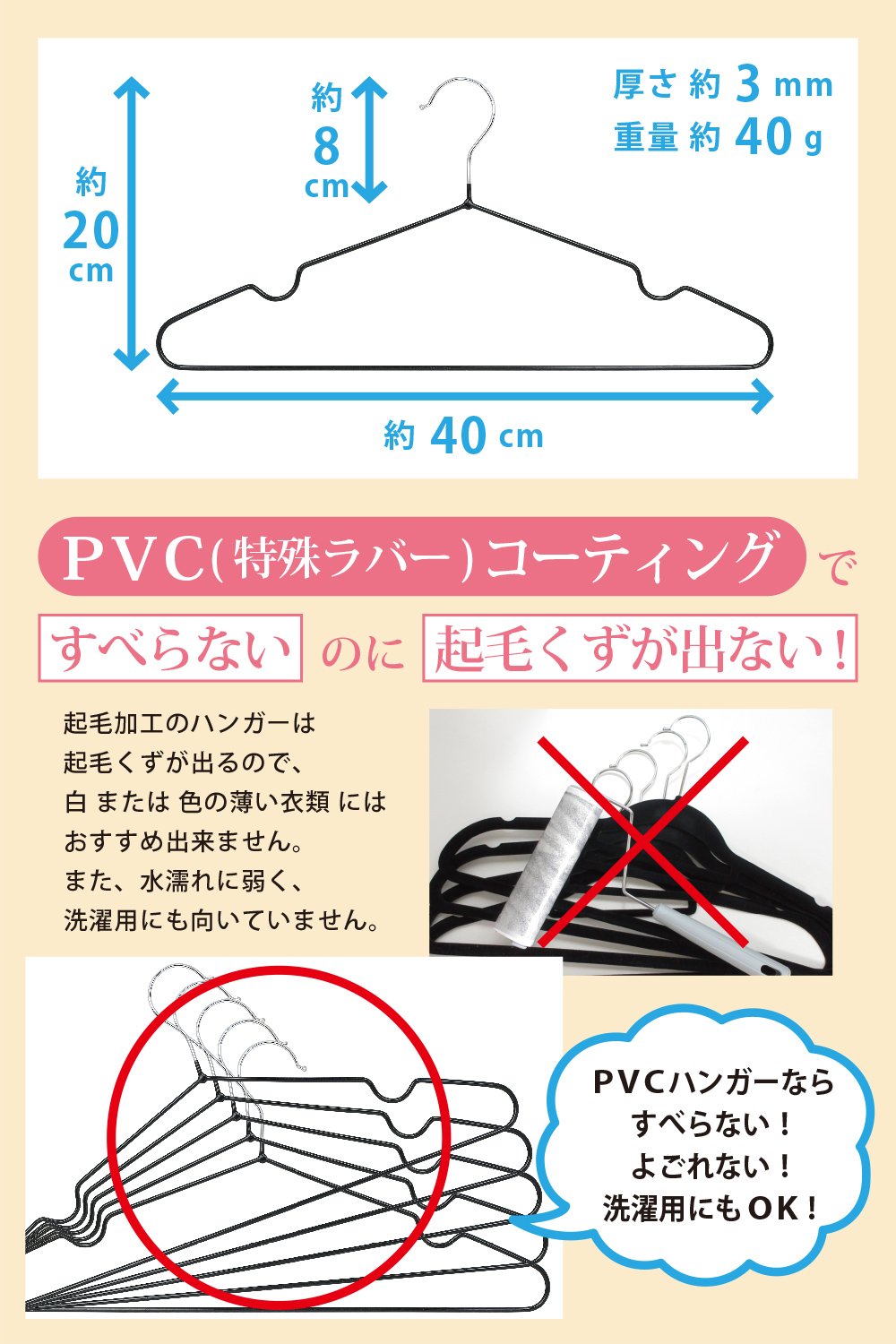 【絶対にすべらない】特殊PVC加工でどんな服でもすべらない!くぼみの部分も滑りません。PVCの特殊ラバー加工によって、あらゆる素材を掴んで落下を防ぎます。 【すべりやすい素材の服でもすべらない】Lot'sのハンガーは強度があり、滑りやすい物でも滑らないのでどんな衣服にでも使えます。強度があるのでプラスチックでは心配なコート類にも適しています。滑りやすいナイロン素材のジャージ等もがっちりつかんで滑らせません。 【より軽く,より強く】PVC特殊ラバー加工でステンレスより軽く、プラスチックハンガーよりはるかに強い、いいとこどりのハンガーです。PVCは工業製品で良く使われてるプラスチックの一種でビニールハウス等にも使われています。このことから、耐水性と耐候性に優れていることがわかります。洗濯物用のハンガーとして最適な素材です。 【起毛くずが出ないので白い服にもOK】従来の滑らないハンガーはビロードの起毛加工のものが多いです。起毛加工は滑り止めには大きな効果がありますが、起毛くずが出てしまうのが弱点でした。PVCハンガーではその問題を解決しています。