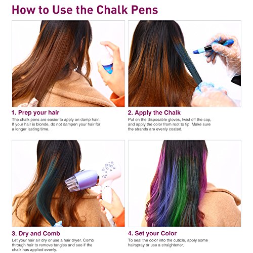 - ❤ STUNNING ON ALL HAIR COLORS: It doesn't matter if your hair is dark, light, or somewhere in between? these chalk pens work well with all hair types! They're the perfect choice for cosplayers, partygoers, or anyone who want to switch things up without the commitment of dye.