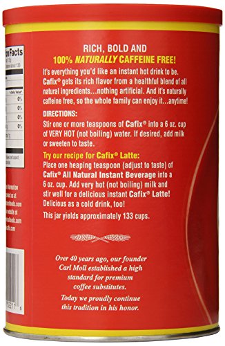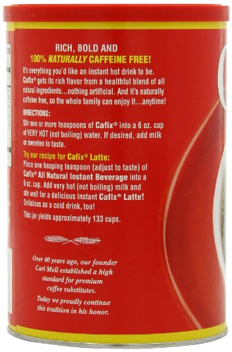 ReleaseDate : 2006-02-28 Studio : Cafix Publisher : Cafix Binding : Grocery Product Description Cafix is the perfect alternative to hot caffeinated beverages. It's everything you would like an instant hot drink to be. Cafix offers a rich, coffee-like flavor yet none of the caffeine or acidity found in coffee or tea which can stimulate the nervous system or cause an upset stomach. Cafix is not a decaffeinated product but a healthful blend of all natural, caffeine free ingredients, so the whole family can enjoy it anytime - hot or cold! 0