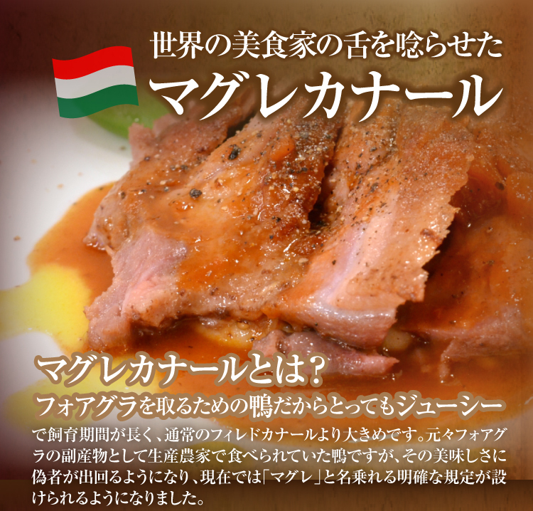 しっとりとした濃い味わいの肉質で、フォアグラとの相性もバツグン!ガバージュ肥育したマグレは色味も鮮やかで、肉の味も良く上質な脂がしっかりのっており、ローストはもちろん、たたきやしゃぶしゃぶ、煮込み料理などにもおすすめです。