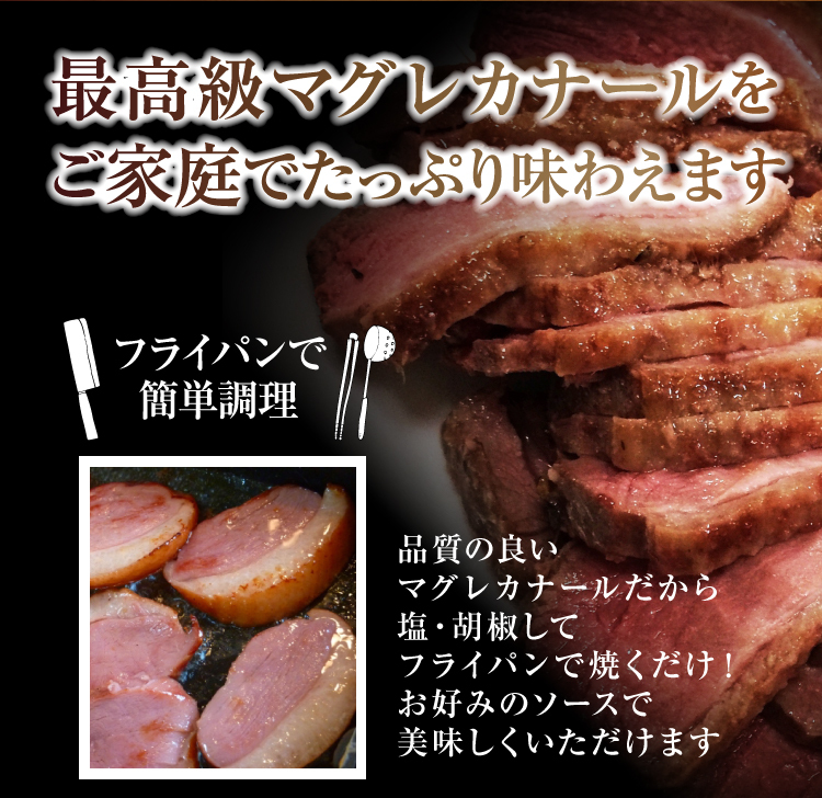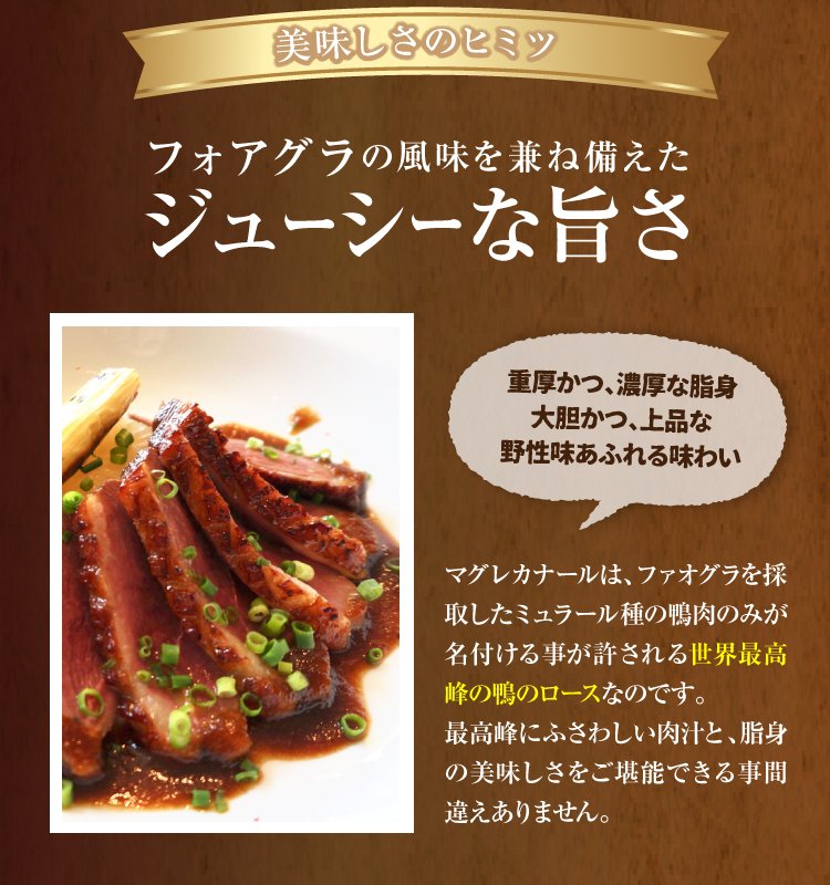 フォアグラを採取するために育てられたミュラール種鴨の贅沢な副産物であるマグレカナールのフィレ肉は、フォアグラの風味も兼ね備えたコクと厚みのある最高級鴨ロースで、分厚い脂には甘みがあります。