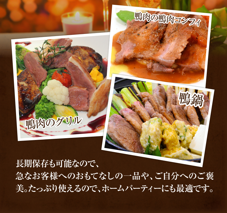 参考メニュー: ロースト、ソテー、たたき、鴨鍋、鴨南蛮、サラダ、燻製、蒸し