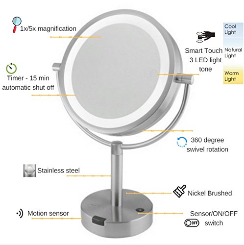 Ovente Sensor Mirror for Makeup with 3-Lighting Tone (Daylight, Cool, Warm), 1x/5x Magnification, 8.5 inch, Nickel Brushed (MPTS8385BR1x5x)