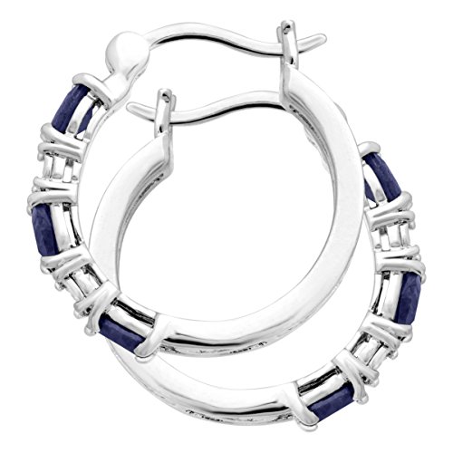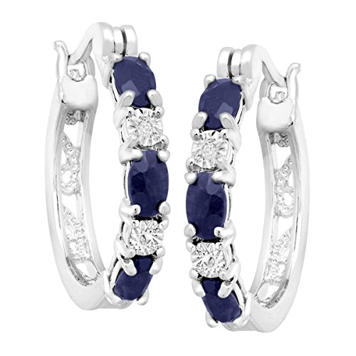 A never-fail style gets the special treatment with a smattering of radiant gemstones and diamonds! Trios of oval-cut natural sapphires are joined with round diamond accents in a set of platinum-over-brass hoop earrings for a truly shining, yet affordable, look. The hoops feature six oval-cut natural sapphires, totaling 2 1/10 carats , as well as round-cut diamond accents gleaming in each piece. Each earring measures 7/8 inches in diameter and features hinge with notched post back findings. Dainty enough for everyday wear, the bold stones offer an added touch of glamour for special occasions.
