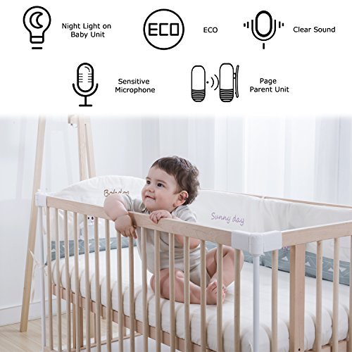 [Smart ECO, Power Saving and Noise Reduction] When the noise in the baby's room is under 40db for over 20seconds, the smart ECO feature will be enabled and the monitor will eliminate the slight background noise until the noise is over 40db and the monitor will be woken up. In general, the sound of human voice is 60db, bird calls is 44db, and the sound of breathing is 10db. It accurately lets you know when your baby makes a sound. Just trust it!