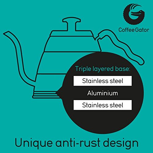 HUTEN SIE SICH VOR PREISWERTEN NACHAHMUNGEN Coffee Gator bietet eine hochwertige Verarbeitung und verwendet chirurgischen Edelstahl fur Ihren Kaffeekocher zum Aufgiessen per Hand. Dieser kann mit Induktions-, Halogen-, Gas- oder Elektroherden verwendet werden. *Bitte beachten Sie, dass der Wasserkocher 1,2 Liter fasst, doch das Kochen mit voller Kapazitat kann ein Risiko zum Uberlaufen bergen.