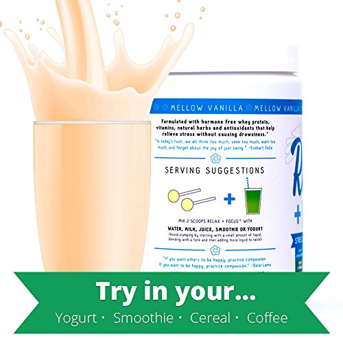 ALL-NATURAL HERBAL STRESS & ANXIETY RELIEF - Seeking an alternative to pharmaceuticals? Relax + Focus includes a total of 10 natural herbs & amino acids, and 10 vitamins & minerals which include but are not limited to: Ashwagandha, L-Theanine, Passion Flower, Rhodiola Rosea, Calcium, Magnesium, Vitamin C, B Vitamins, PLUS 5 grams of hormone free whey protein.