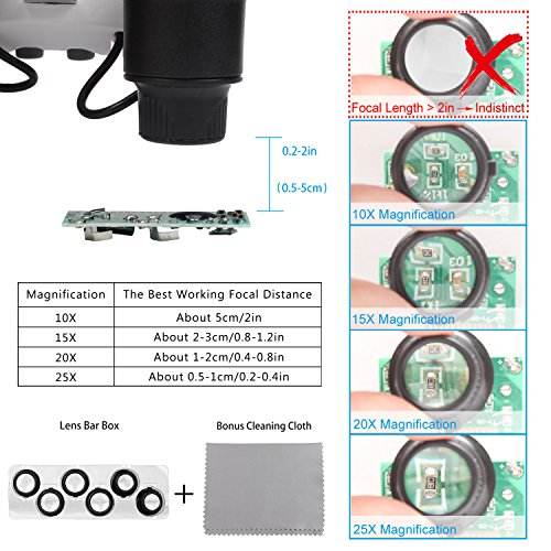✔ 10X, 15X, 20X, 25X Powerful Lenses - can be interchanged quickly and put in corresponding lens bar box. Bonus: we include a cleaning cloth for you to remove dust, dirt & fingerprints, enhancing the view for the small parts or details.
