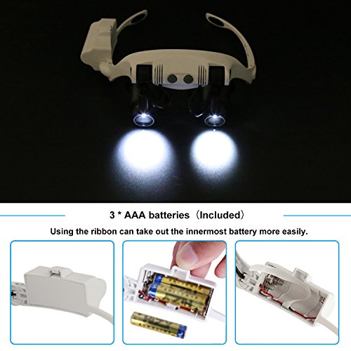 ✔ Illuminate while You Magnify - be able to work in low-light conditions with 2 adjustable LED lights powered by 3 AAA Batteries (Included). Its battery duration is twenty hours longer than the old-style product with button batteries.