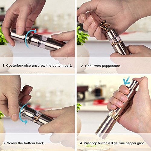 Studio : ERCRYSTO Publisher : ERCRYSTO Product Description *Mini Thumb Push Salt and Pepper Mill *salt pepper grinder can also be used with other seasonings *High quality stainless steel *Elastic pressure head *One Hand Operated grinde *Healthy environmental protection easy to clean *The small round design does not take up much space at the dinner table. PLEASE USE MEDIUM SIZED PEPPERCORNS OR SEA SALTS
