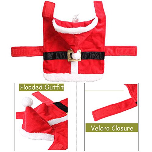 -. Feature : Free Size(Adjustable): fit pet's Neck Girth 10.6 to 11.8 inches and Chest Girth 16.5 to 17.7 inches / Made for Cats, Puppies and Small Sized Dogs / Made of polyester fibre and plush, easy on and off with velcro / A unique pet santa outfit to have your pet get as much attention as you at parties or holiday occasions, perfect for Christmas, parties, special occasions, and photo shoots / Package included: 1*Pet Santa Claus Outfit + 1*Silver Metal Bolbove Keychain