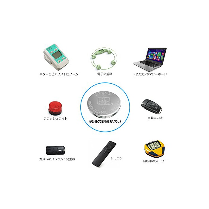 키친 가전,생활 가전,이미용 가전,조명 가전,계산기나 게임기,시계,디지탈 카메라,전자 수첩,포케몬GO플러스,LED라이트,전자 사전,혈당치 측정기 등에 사용되는 CR2032코인형 리튬 전지입니다.