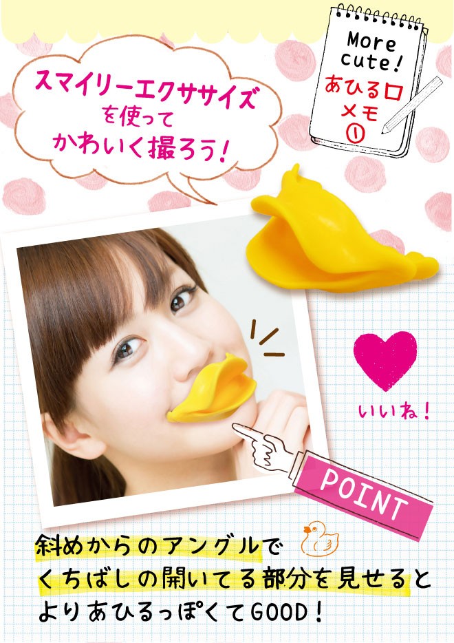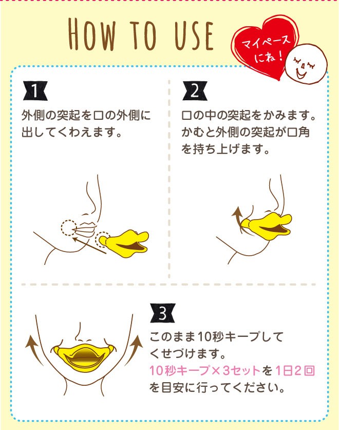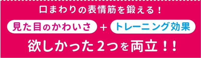 | 商品説明 | かわいくキュッ!1日2回、くわえてキープ! 口まわりの表情筋を鍛えて口角をあげる! かわいいあひる口で見た目も楽しく。 |