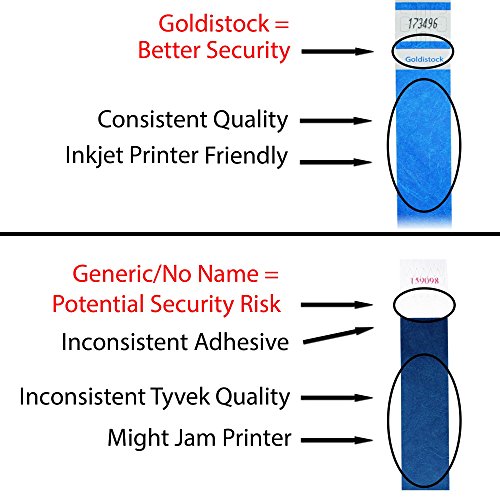 -. Feature : GOLDISTOCK SELECT SERIES - Goldistock Wristbands are reliable and consistent. Why risk the success and security of your event with Generic/No-Name Wristbands that have inconsistent quality? / TRUSTED SUPPLIER - Event organizers trust the Goldistock Brand. Our wristbands have been used in over 100,000 events all across the USA and the world. We stand behind our wristbands with a 100% satisfaction guarantee. All material for our wristbands are made in the USA. All manufacturing is in the USA. / THE "BETTER SECURITY" WRISTBAND - (SEE IMAGE #2) The "Goldistock" name P.R.Inted on the wristband helps protect you from gatecrashers. They come to you fan folded in one long continuous sheet. A continuous sheet offers better security than generic single sheets (no "missing" sheets) and are overall easier to handle especially during an event. / INKJET P.R.INTER FRIENDLY - Goldistock Wristbands are inkjet P.R.Inter friendly. We do NOT recommend P.R.Inting with a laser P.R.Inter. IMPORTANT- For more detailed information on how to P.R.Int on Goldistock wristbands SCROLL TO THE PRODUCT DESCRIPTION SECTION. / IDEAL FOR ANY EVENT - Concerts, sporting events, parties, fairs, water & amusement parks, trade shows, conferences, school functions, seminars, nightclubs, or any kind of event. For more detailed information SCROLL TO THE PRODUCT DESCRIPTION SECTION.