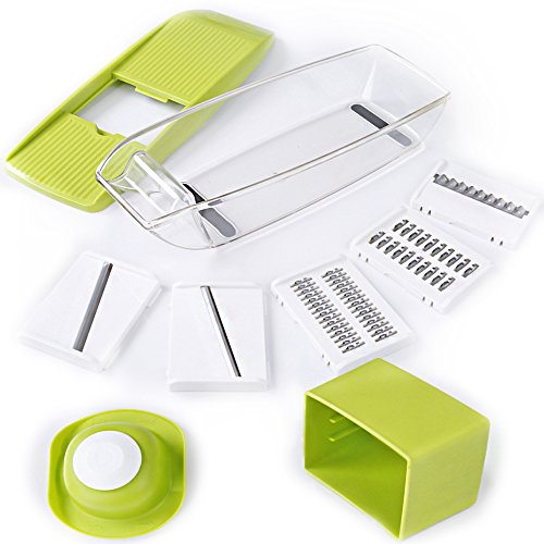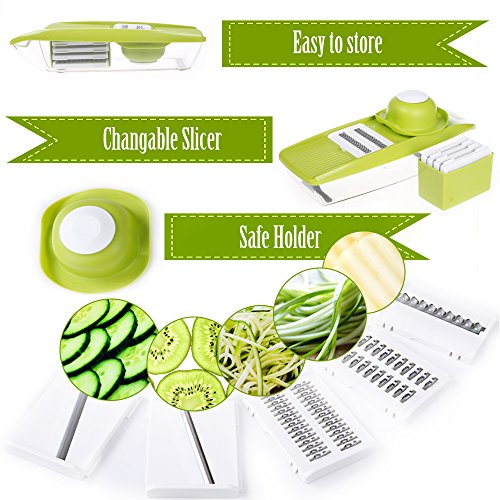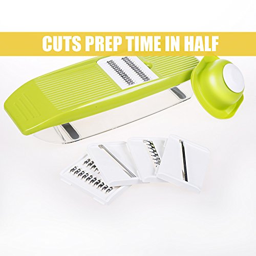 Studio : KitchenBasix Publisher : KitchenBasix Product Description Kitchen Basix Mandoline Slicer is an adjustable vegetable cutter, peeler, grater, slicer, spiralizer, chopper with 5 built-in ultra sharp interchangeable stainless steel blades, food storage, and safe hand protector. It is made from high quality ABS non-toxic, BPA free plastic and blades are made from food-grade material and 304 420 stainless steel.