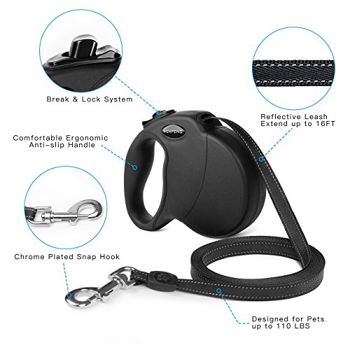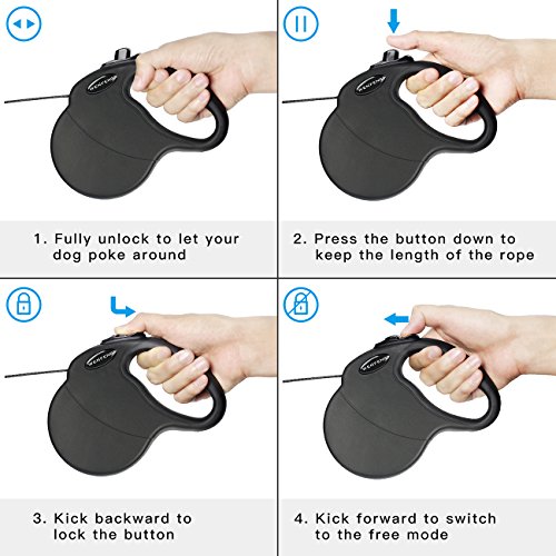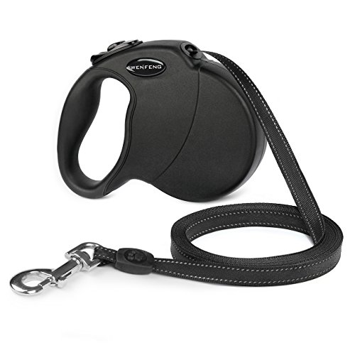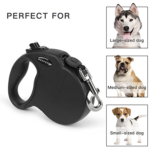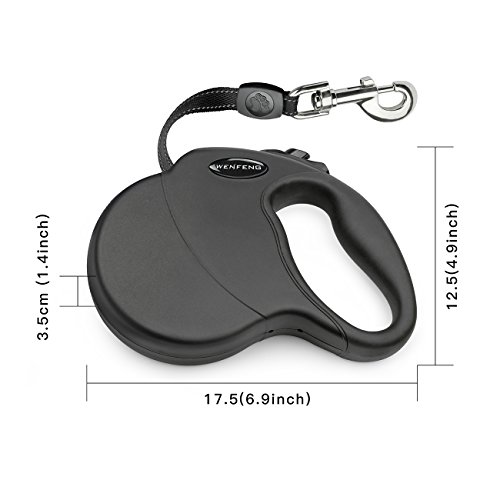 Studio : WENFENG Publisher : WENFENG Binding : Misc. Product Description Walk Your Dog Freely in an Open Area The retractable dog leash can expand up to 16ft, strong and durable, made for daily use, with a strong spring for smoothly retracting dog leash. The brake and lock button on the top of the leash lets you adjust the length of the leash as you need, push the button down to lock the leash, and click and button back to easily reel your dog back in, so you could walk your dog with full control, and give them more freedom to wander, sniff, and poke around. Kindly Note - Don't allow small children to use the leash. - Please dry the leash before retract, if it get wet. - Never try to open the plastic casing, disassemble any other parts, the spring inside may cause unexpected injuries. - Make sure to check that all parts of the leash and your dog's collar are in good condition before use. Specifications Material: PP casing TPE anti-slip handle Polyester Leash Zinc Alloy Hook Size: L Maximum Tension: 110 lbs Color: Black Adjustable Length: 16ft Weight: 0.92pounds Dimensions: 7.2 x 5.4 x 1.4 inch (L x W x H)? Package Include: Retractable Dog Leash User Manual