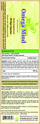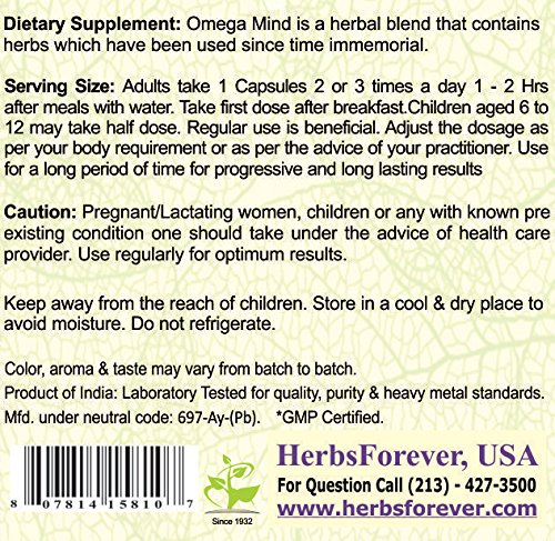 "Omega Mind" contains the herbs which have safe history of usage for many centuries in Ayurveda (Indian Herbal System). Non-GMO, Gluten-Free, Vegetarian (Cruelty Free product), Wild Crafted - Full Spectrum, High quality extracts and micronized powder of wild crafted herbs from their natural habitat,This product is concentrated extract form (Not just simple bulk herb powder) Extract enhances potency, efficacy and health benefits to a great extent. Extracts are dried with the powder of the same herb, No filler, No binder, No preservatives, Direct from the manufacturer, Authentic, A-Grade Quality, Sourced from its natural habitat mostly collected from forests and eco-friendly. We do not add any gluten, soy, milk, wheat, peanuts, shellfish, filler, external or foreign agent, colors, artificial ingredients, flavours, lactose, etc in capsules or tablets except the HERB itself. Herbs are washed in cold water to keep the full potency/retain properties of herbs which might get lost some in water flow. The product is prepared as per traditional Ayurvedic standards. HerbsForever maintains the quality standards like purity, potency and freshness of its herbal dietary products by storing them in climate controlled, light controlled and atmosphere regulated storages. Thus, no chances of outside vermin and pests infestation.Feature