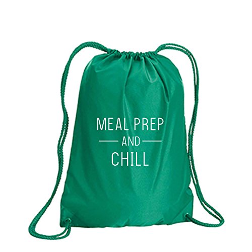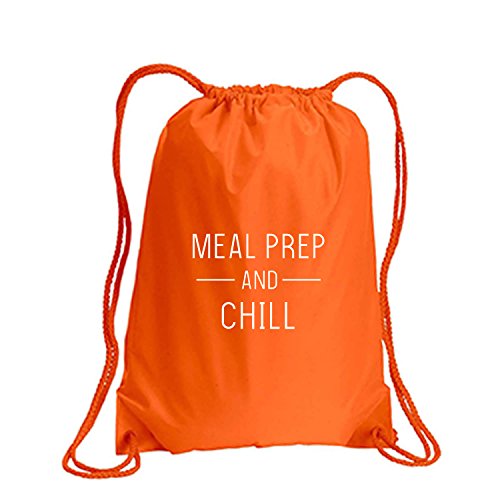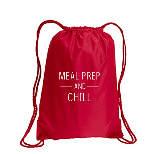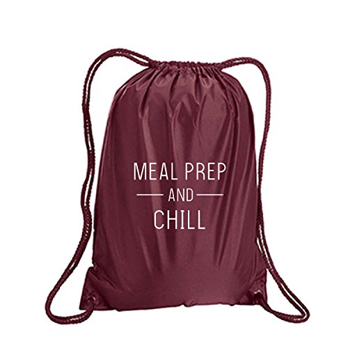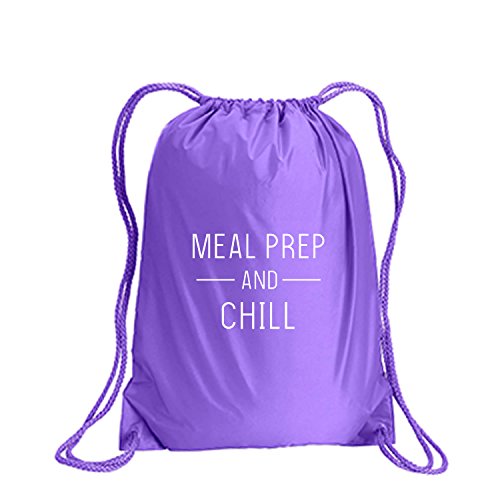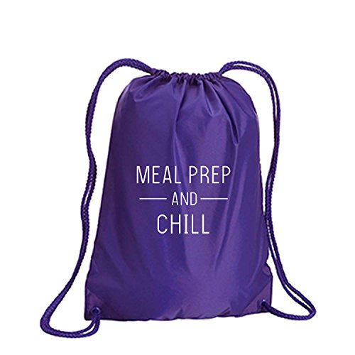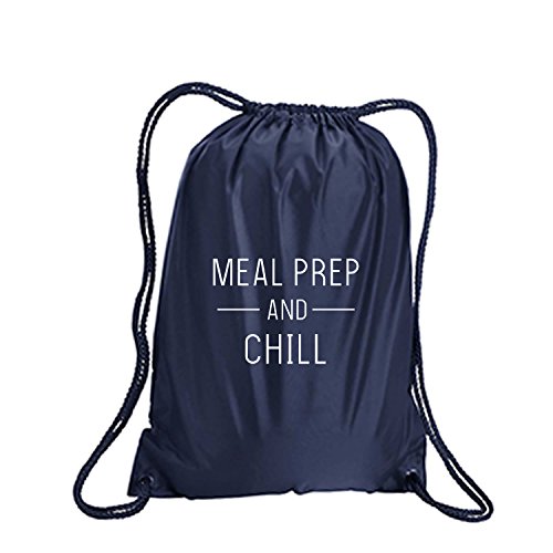 Product Description This durable and stylish nylon tote features "Meal Prep and Chill" on a cinch pack tote with white ink. Bag comes in small and large sizes and is made of a durable 210 Denier nylon and has color-matched draw cords. Printed in the USA on an imported bag. 0