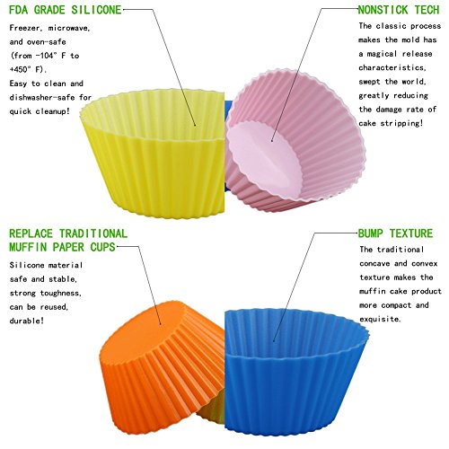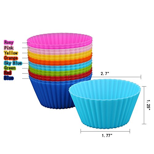 - 40 Round Silicone Baking Cups in 8 fun and vibrant colors(Blue, Green, Orange, Pink, Red, Rosy, Yellow, Sky Blue).Round baking cup measures 2.7" wide at the top with a height of 1.25".