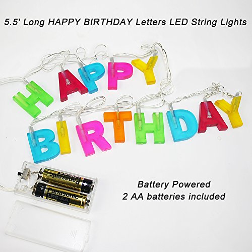 -. Feature : A MUST HAVE FOR BIRTHDAY PARTY- 1.2-inch Individual CAPITAL letters on an approx 5.5 ft long cable, available in 6 colors: green, red, blue, orange, fuchsia and yellow - the light will put a celebratory smile on everyone's face. Colorful semitransparent letters like boiled sweets - perfect for anyone's birthday party of any age: girls, boys or adults. Starburst shines through colorful letters at night - achieve a lighthearted & engaging party ambience - Now get the party started! / EASY DECORATING - Mixed colors make your light well coordinate with other birthday supplies - brighten up any theme of birthday parties. Lower power consumption, lightweight construction, small battery compartment and a floating effect with transparent cables - allow your string light to be hung anywhere you want to spell out "HAPPY BIRTHDAY" wishes, indoors or outdoors - use it as a table decoration or hang it up on walls, trees and porches or drape over shelves or furniture. / BIRTHDAY PARTY IDEAS - Get multiple HAPPY BIRTHDAYs and display them in more areas for extra party cheer - Hang on a wall, over a doorway, across a balcony, or from a ceiling - The plastic packing box with letter shaped tray your light came in, offers a perfect way to store - free from getting tangled or knotted, save your next decoration time - safe from critters, squish or moisture damage, save your investment - adorn next birthday parties of your family members or friends with your light. / DURABLE & ENERGY CONSERVATION - No power outlet needed - provide immediate, significant energy savings while enhancing your party cheer; Requires 2 AA batteries (included) per set, with an ON and OFF switch on the battery box; Long lasting LED bulbs produce no heat after long-time use - not easy to scald or break down; Made of PVC - durable, lightweight and BPA free - in perfect shape for next birthday party - Comes in a gift box, ready for gift giving to friends, relatives and loved ones. / DEVOTED CUSTOMER SERVICE - Genuine BRIGHT ZEAL home LED light products - Certified under UL588 and Complies with 16 CFR 1120.3(c) - TRADEMARK filed in U.S.A. - In business since 1997 - For U.S. customers, this product comes with 1-MONTH FREE TRIAL & FREE life time customer service - You can always come to us for free customer service at: http://www.amazon.com/seller/BRIGHT-ZEAL