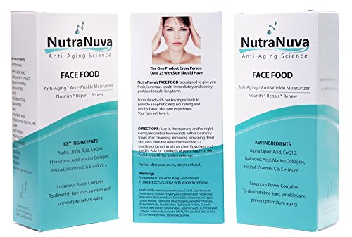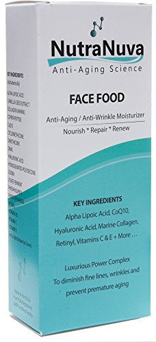 -. Feature : NutraNuva means NOURISH * REPAIR * RENEW -- Your Skin Becomes Fully NOURISHED Allowing it to be Naturally REPAIRED while Causing Healthy Cellular RENEWAL. This Creates Collagen and Elastin which Gives You Smoother, Softer, Younger-Looking Skin. Recommended by Both Dermatologists and Plastic Surgeons due to a Scientific Clinical Study Resulting in 44.9% Less Appearance of Fine Lines and Wrinkles In 2 Months (subjects - age 29 to 74 - applied twice daily). / NO HARMFUL FILLERS, PARABENS, DYES, SULFATES. PEGs, PETROCHEMICALS or ANIMAL TESTING. GMO & GLUTEN FREE. NOT Oily, Greasy or Sticky. Works Great Under Makeup with No Breakouts. Fast Absorbing, Lightweight and Loaded with Whole Foods Standards Approved Anti Aging Natural Key Ingredients - see "Product Description" below. 2 Full Ounces. A Little Goes a Long Way. Luxury You Can Afford. / EXPERIENCE CELLULAR ACTION - Some People Feel a Light Tingling Sensation for About 60 Seconds As Our Key Ingredients Start to Work Rapidly at a Deep Cellular Level on Undernourished, Thirsty or Damaged/Aging Skin. Night / Day Anti Aging Face & Eye Moisturizer Cream with Vitamin C - Hyaluronic Acid - PhytoCeramides - Amino Peptides - Retinol - Copper Peptides - CoQ10 - Vitamin E - Matrixyl 3000 - Marine Collagen and more. / HOLLYWOOD PLASTIC SURGEON Dr. George Orloff - "I recommend FACE FOOD for women and men" - see his 5-STAR Review below titled "Doctor Recommended". (Dr. Orloff was not compensated in any way for his endorsement.) A little-known fact is that SPF can DEGRADE the effectiveness of other ingredients and for that reason THERE IS NO ADDED SPF IN FACE FOOD. / MADE IN THE U.S.A. in an FDA-Registered State-of-the-Art Laboratory with Green, Recyclable Packaging. FOR BEST RESULTS, Use with FACE FOOD Anti Aging Serum Complex with 20% C along with our NEW All-in-One Cleanser, Exfoliator & Toner - Frequently Bought Together. Buy the Cleanser and Take 15% Off with this AMAZON COUPON CODE: 5QEYYBLP