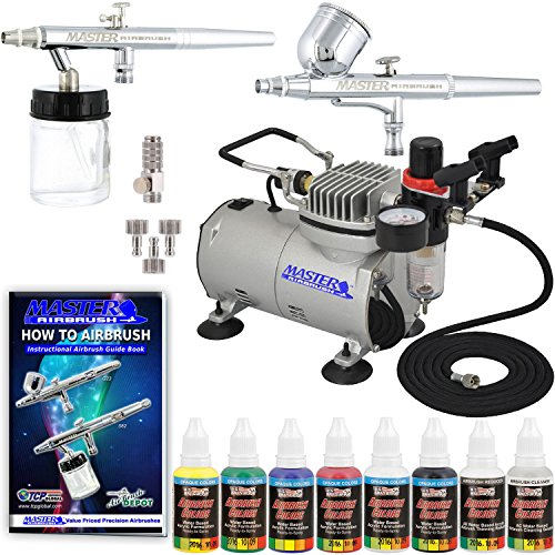 Master Airbrush U.S. Art Supply Paint System. Includes Our MASTER G22 Precision Dual-Action Gravity Feed Airbrush Set, MASTER G68 Precision Dual-Action Siphon Feed Airbrush Set, with Airbrush-Depot TC-20 Air Compressor. You also get a quick connection coupler for each airbrush that allows you to instantly change from one airbrush to another as you need to.* 6' Braided Air Hose with a Mini-Inline Water/Moisture Filter * Airbrush-Depot Brand Model TC-20 Maintenance Free Air Compressor with Automatic On/Off Shutoff, Air Regulator w/Gauge & Water Trap Filter * U.S. Art Supply 6 Primary Most Popular Airbrush Paint Colors (Black,Blue, Red, Green, Yellow, White) * Airbrush Holder for up to 2 Airbrushes.Now Included is a How to Airbrush Training Book to Get You Started, published exclusively for TCP Global customers.Feature